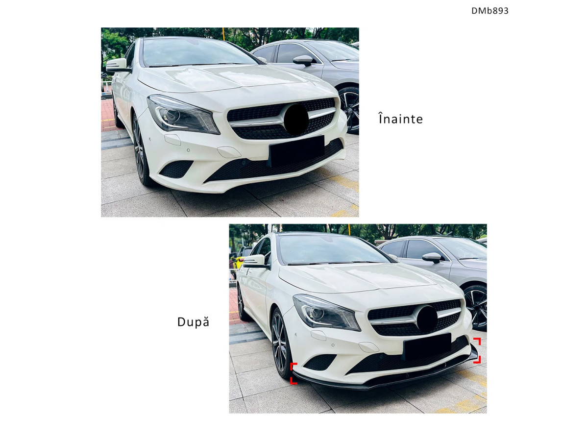 Eleronul față tuning DMb893 este compatibil cu modelele Mercedes CLA C117 și X117 Pre-Facelift Standard. Produsul este adaptat pentru barele față originale ale acestor modele, asigurând o potrivire precisă și un aspect integrat.